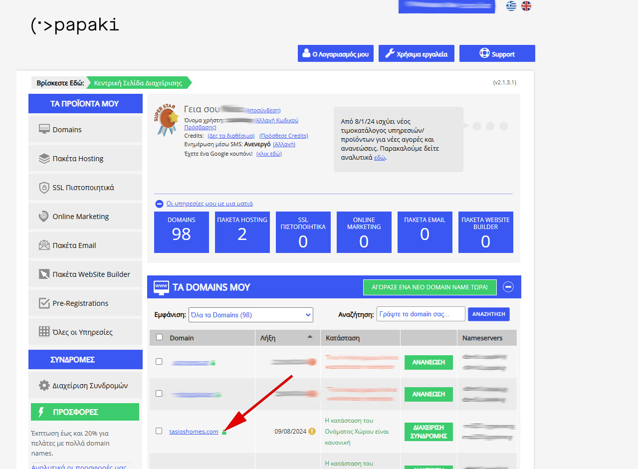 Αφού συνδεθείτε στον λογαριασμό σας, εντοπίστε στο κάτω μέρος το domain για το οποίο επιθυμείτε τον κωδικό εξουσιοδότησης και πατήστε επάνω του.