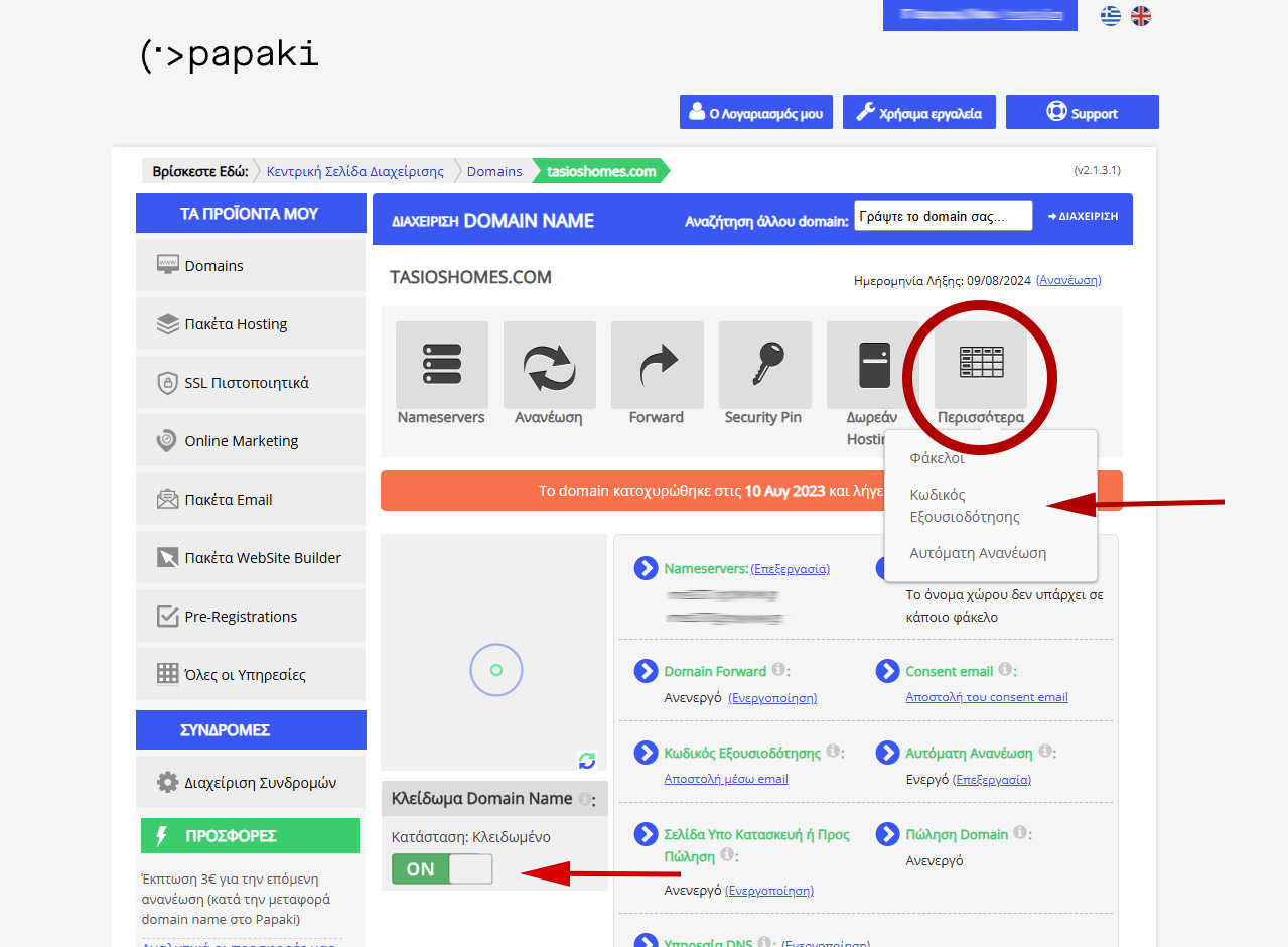 3. Περισσότερα > Κωδικός εξουσιοδότησης & Ξεκλείδωμα domain