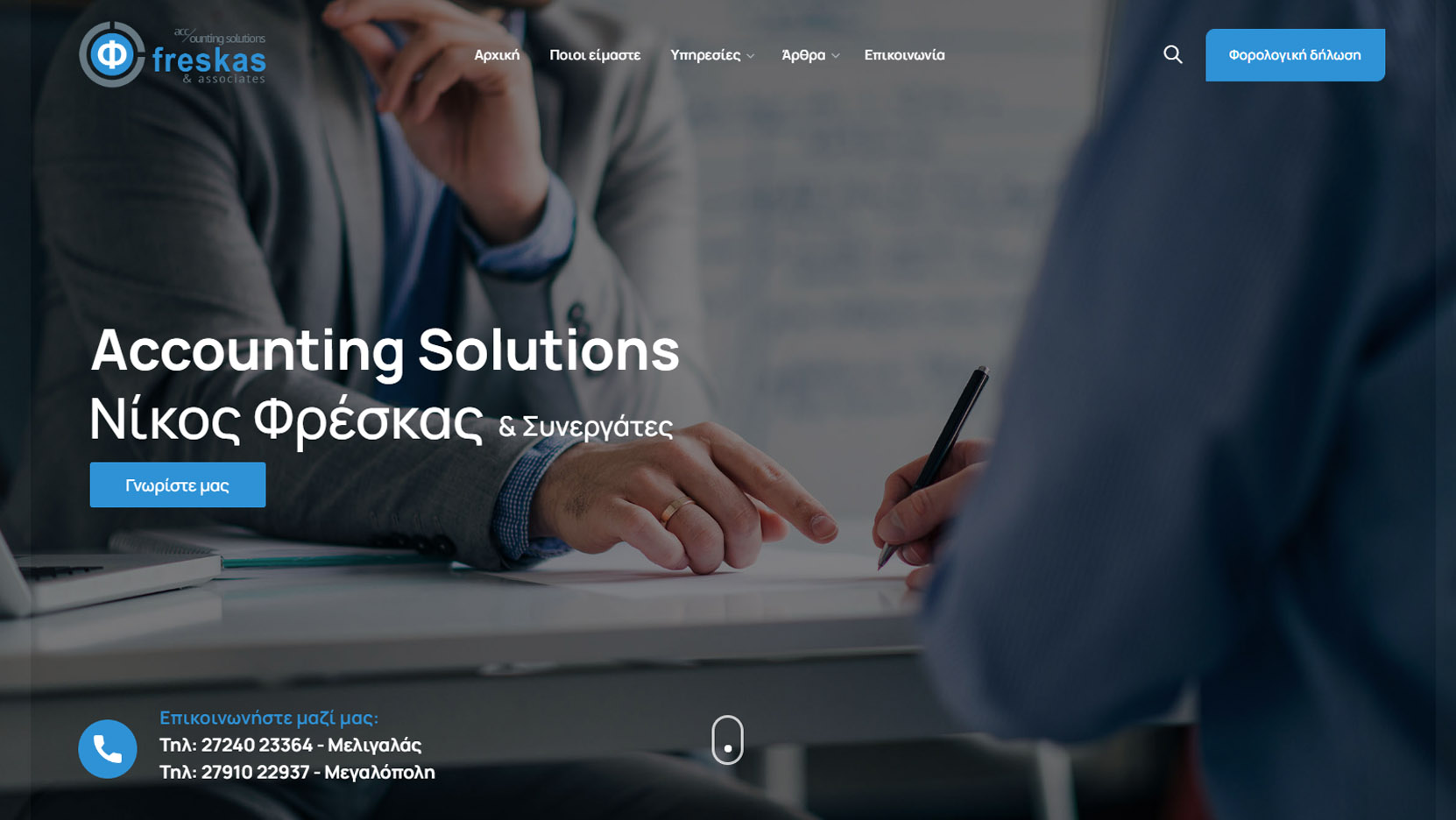 Η επιτυχημένη πορεία της επιχείρησής εδώ και 35 χρόνια σας εξασφαλίζει έναν αξιόπιστο συνεργάτη. Για το λογιστικό γραφείο - Φρέσκας & Συνεργάτες η κάθε περίπτωση είναι ξεχωριστή. Προσεγγίζουν με μεθοδικότητα τις ανάγκες κάθε επιχείρησης, μικρής ή μεγάλης και σας προτείνουν λύσεις που να ταιριάζουν σύμφωνα με τις ιδιαιτερότητες της κάθε επιχείρησης.